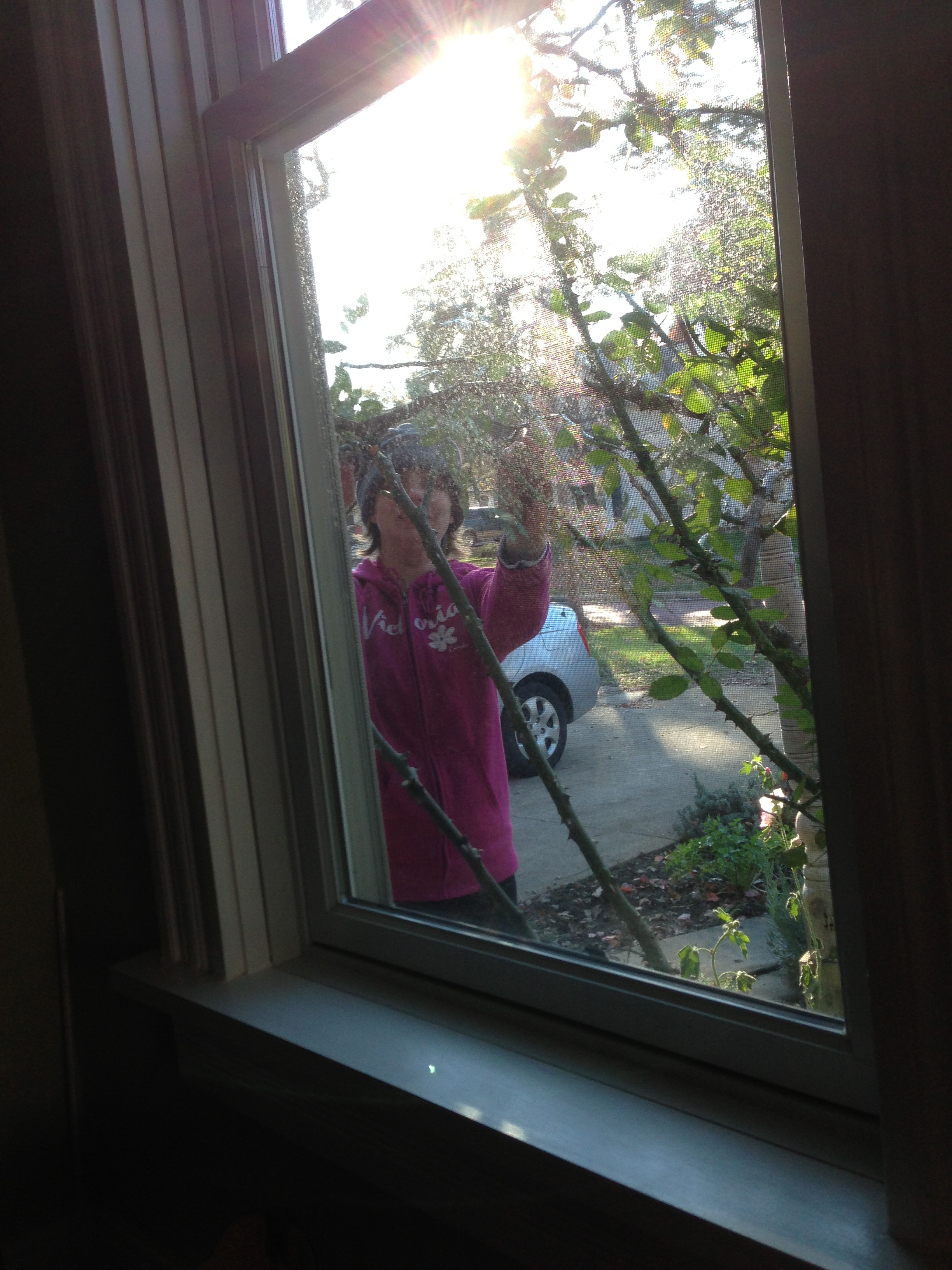 After we returned home, Allyson decided to continue some yard work, part of which was the trimming of our infamous Front Rose Bush. It’s a hearty climbing rose that blooms and blooms every year, but has taken over a bit in recent years. Here are some photos of her trimming and surveying her work.