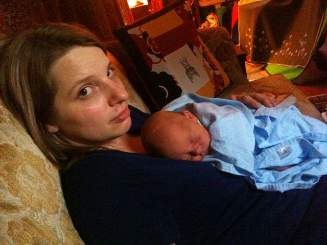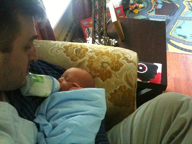 The timing of my company trip to Nashville couldn’t have been worse… Ally has been all alone these past two days and night. She’s hanging in there, but she is admittedly exhausted. I’m prepared to stay up all night the next few nights (and any night I need to), since I was able to get good rest last night. She had a friend come over to assist the night I was gone, and Heidi and The Other Aidan came over today to meet the baby and play. Here’s another picture of the baby with me on the first day we had him.